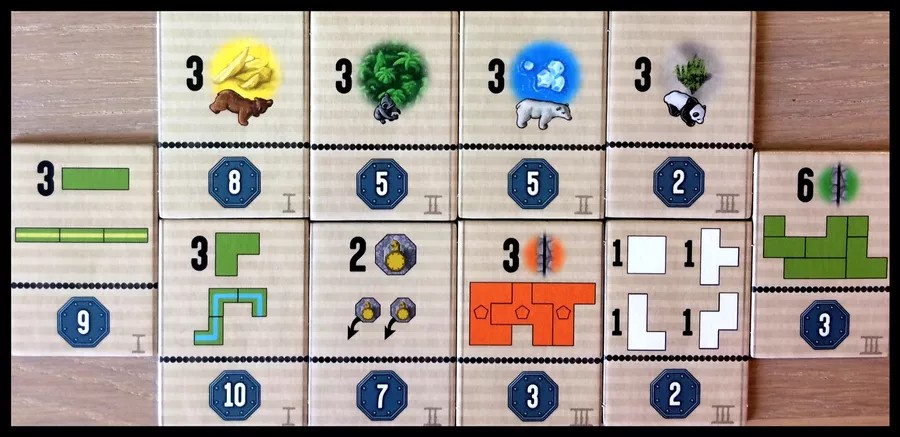 Até 900 kgs de peso e mais de 2 metros de altura, o urso é considerado o maior e mais pesado carnívoro terrestre do mundo. Claro, não há apenas um urso; pelo contrário, há uma abundância de subespécies que diferem uns dos outros em vários aspetos. Por exemplo, apenas o urso de Kodiak (ursus arctos middendorffi) pesa cerca de 900 kgs. O urso polar (ursus maritimus) pesa 500 kgs, mas fica muito maior que o urso Kodiak, com até 3,40 metros de altura! Bärenpark leva-te para o mundo dos ursos, desafiando-te a construir o teu próprio parque de ursos. Preferes uma jaula de urso polar ou uma casa de koala (* Não, koalas não são ursos, mas eles são tão lindos que não poderíamos deixá-los fora deste jogo!)? Os visitantes do parque estão famintos por comida enquanto estão no parque, por isso precisas construir lugares para eles comerem! Quaisquer que sejam as tuas escolhas, certifica-te que obténs a próxima licença de construção e usa a tua terra com sabedoria! Em mais detalhe, cada jogador em Bärenpark constrói o seu próprio parque de ursos, tentando torná-lo tão bonito quanto podem, enquanto também usam cada metro quadrado possível. O parque é criado pela combinação de tiles de polyomino numa grelha, onde os jogadores marcam pontos por casas de animais, áreas ao ar livre, construções concluídas e muito mais. Quanto mais cedo construires, melhor! Cobre os ícones para obter novos tiles e seções de parque. O jogo termina assim que um jogador tiver terminado de expandir o seu parque, e ai os jogadores contam os seus pontos para ver quem ganhou.