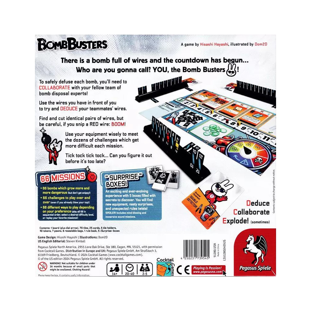 In Bomb Busters, there is a set of 48 normal wire cards numbered 1-12 (4 of each value) with some yellow and red wire cards. These are dealt out. Each mission is different, but your goal is always the same: go through all 12 numbers without blowing up!
