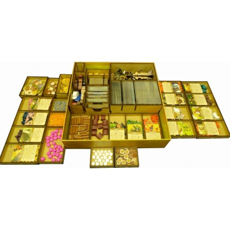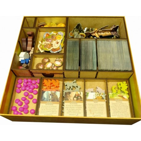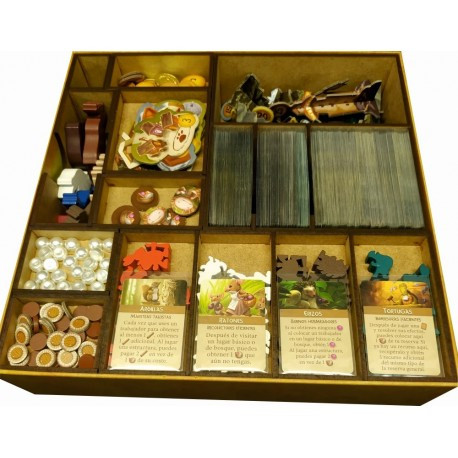 Wooden insert compatible with Everdell (Base game, Pearlbrook, Spirecrest and Bellfire; regular or collector’s editions). Holds sleeved cards. Individual trays, so you can use them to have easy access to cards and components during the game while keeping everything organized.