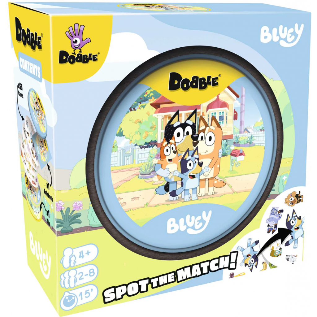 Simple, fast and fun, Dobble is the ultimate game of observation and speed for everyone! Come play with Bluey, Bingo, Mum, Dad and all their friends. Spot the match among the characters and items from your favourite cartoon. With 5 game variants, every game will be different!