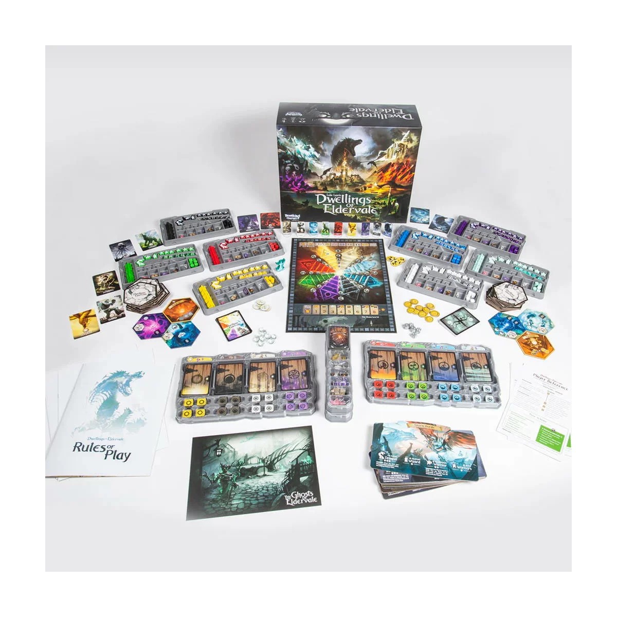 Dwellings of Eldervale blends worker placement, area control, engine building and unique worker units. Players take turns placing a worker in Eldervale or regrouping and activating their tableau of adventure cards. Action spaces include realms key to power: a summoning portal, an ancient mill, the lost fortress, deep dungeons, and a crumbling mage tower and the elemental lands of Earth, Air, Fire, Water, Light, Dark, Order and Chaos! Magic cards grant spells, quests and prophecies to players.