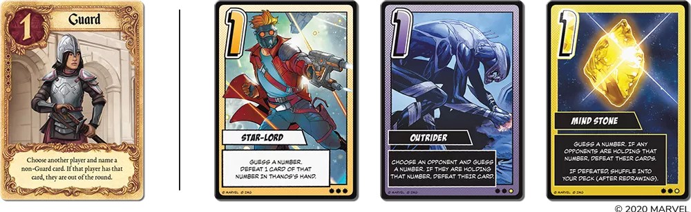 Ao longo do jogo, os jogadores compram e jogam uma carta à vez e depois executam o seu efeito. Os jogadores podem invocar heróis como o Homem de Ferro, o Homem-Aranha, o Thor e a Feiticeira Escarlate para combater e recolher informações sobre os esquemas do adversário. Thanos, um adversário à altura, joga com uma mão de duas cartas, tirando do seu próprio baralho de lacaios e das poderosas Pedras do Infinito. Os heróis terão de utilizar as suas habilidades em combinações estratégicas para reduzir a sua saúde a zero antes que ele lhes faça o mesmo – ou encontrar as seis Pedras do Infinito e vencer com um estalar de dedos. Quem irá prevalecer nesta batalha pelo universo?