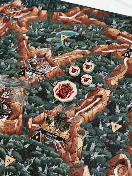 As the Commander of the Ironclad, your primary goal is to lay down the foundations of your forges in the outer mountains, and once you have collected enough crystals, build forges on the foundations. As the Chieftain of the Woodwalkers, your mission is to locate your people’s ancient totems through Vision cards, clear the path to them by defeating Ironclad warbands, and finally securing them in the outer forests, beyond the Ironclads’ reach. Once you have retrieved the third totem as the Chieftain, or built the third Forge as the Commander, you immediately win the game.