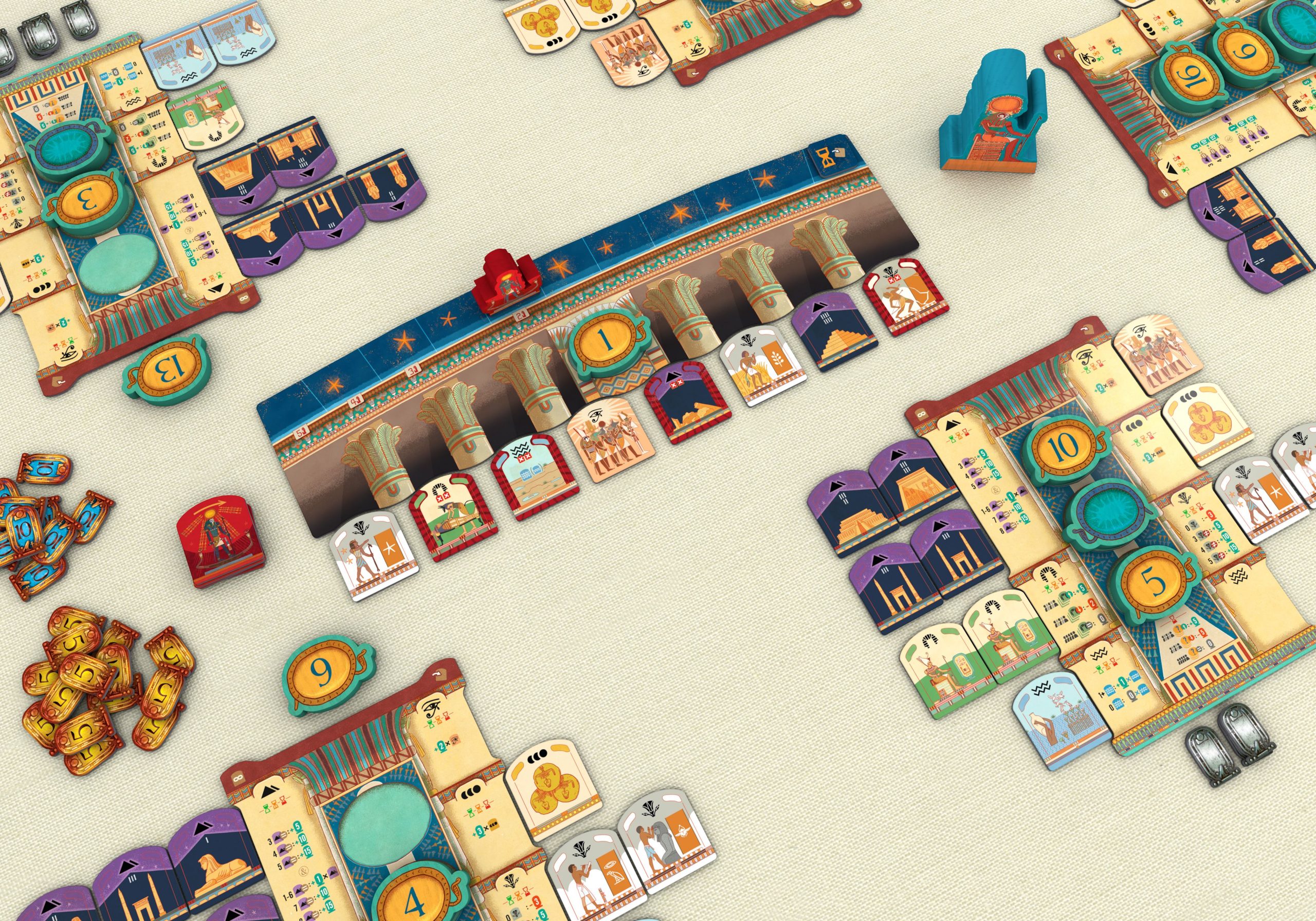 Ra is an auction and set-collection game with an Ancient Egyptian theme. Each turn players are able to purchase lots of tiles with their bidding tiles (suns). Once a player has used up his or her suns, the other players continue until they do likewise, which may set up a situation with a single uncontested player bidding on tiles before the end of the round occurs. Tension builds because the round may end before all players have had a chance to win their three lots for the epoch. The various tiles either give immediate points, prevent negative points for not having certain types at the end of the round (epoch), or give points after the final round. The game lasts for three “epochs” (rounds). The game offers a short learning curve, and experienced players find it both fast-moving and a quick play.