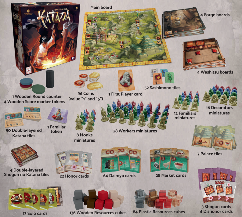 Shogun no Katana is a strategic Eurogame that will transport you to the magical atmosphere of feudal Japan. Use your workers to choose which swords to make, among those requested by the powerful local Daimyo. Collect resources to improve your craft, and request your artists to create breathtaking decorations. Have your family members admitted to the most strategic rooms of the Shogun’s palace to obtain the privileges of their rank. And finally, create the most beautiful SHOGUN NO KATANA!