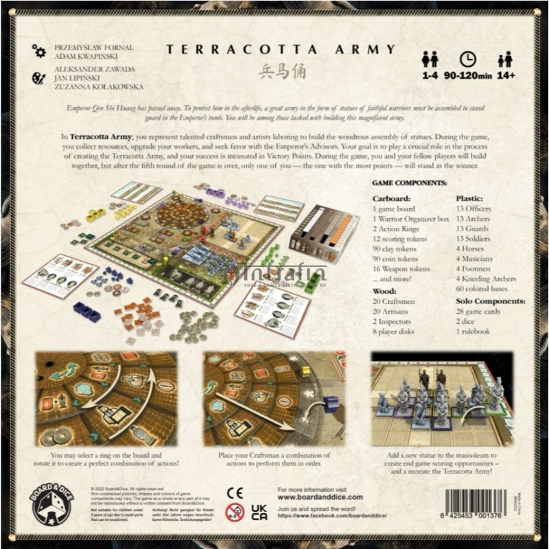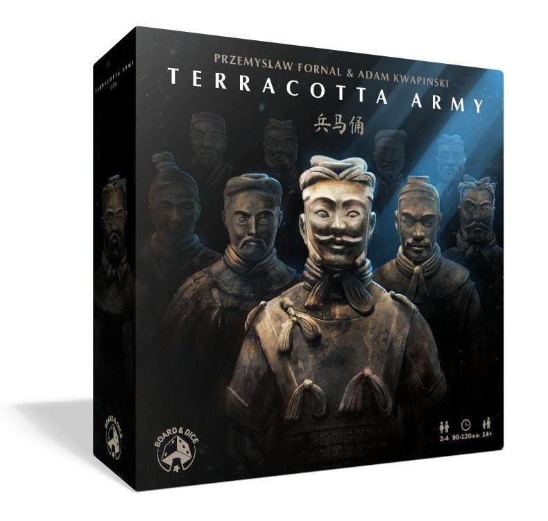 No Exército de Terracota, tu representas artesãos e artistas talentosos que trabalham para construir a maravilhosa montagem de estátuas. Durante o jogo, recolhes recursos, atualizas os teus trabalhadores e procuras o favor dos conselheiros do Imperador. O teu objetivo é desempenhar um papel crucial no processo de criação do exército de terracota, e o teu sucesso é medido em pontos de vitória (VPs). Durante o jogo, tu e os teus companheiros constroem o exército juntos, mas após o término da quinta rodada, apenas um de vocês – aquele com mais pontos – será o vencedor.