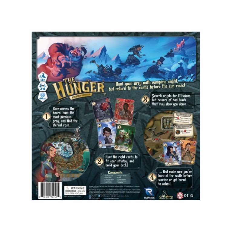 The Hunger é uma corrida em que cada jogador terá de optimizar o seu baralho de cartas, caçar Humanos para ganhar Pontos de Vitória, cumprir Missões secretas e, eventualmente, adquirir uma Rosa e regressar ao Castelo antes do nascer do sol. Quanto mais caças, mais lento tu e o teu baralho se tornam, o que torna cada vez mais difícil regressar antes do nascer do dia. Consegues tornar-te o Vampiro mais famoso sem te queimares ao nascer do sol?