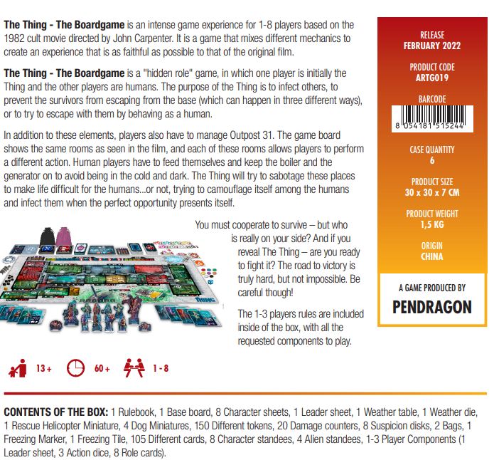 The Thing is a game that mixes different mechanisms to create an experience that is as faithful as possible to that of the original film. It is a “hidden role” game, in which one player is initially the Thing and the others players are humans. The purpose of the Thing is to infect others, to prevent the survivors from escaping from the base (which can happen three different ways), or to try to escape with them by behaving as a human.